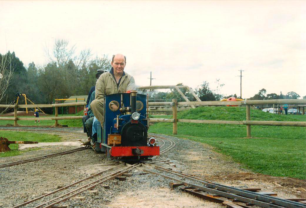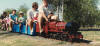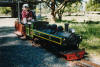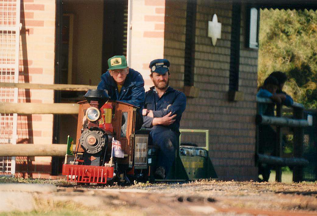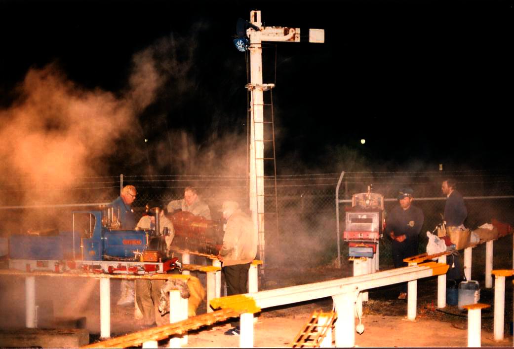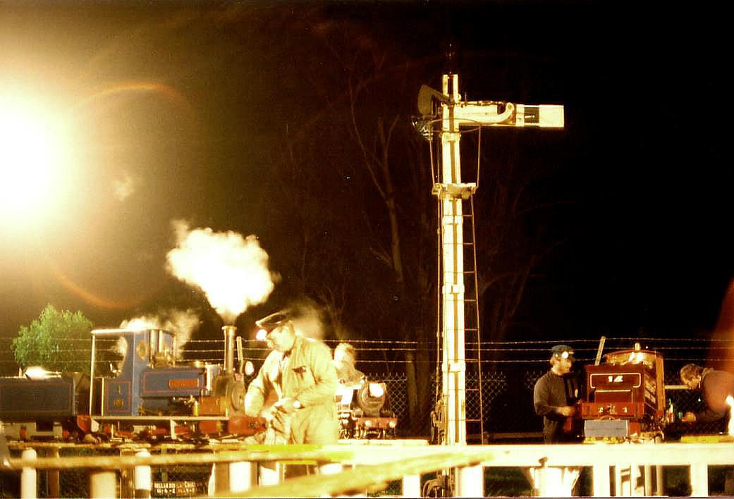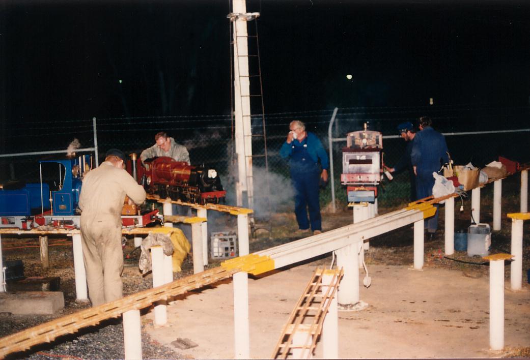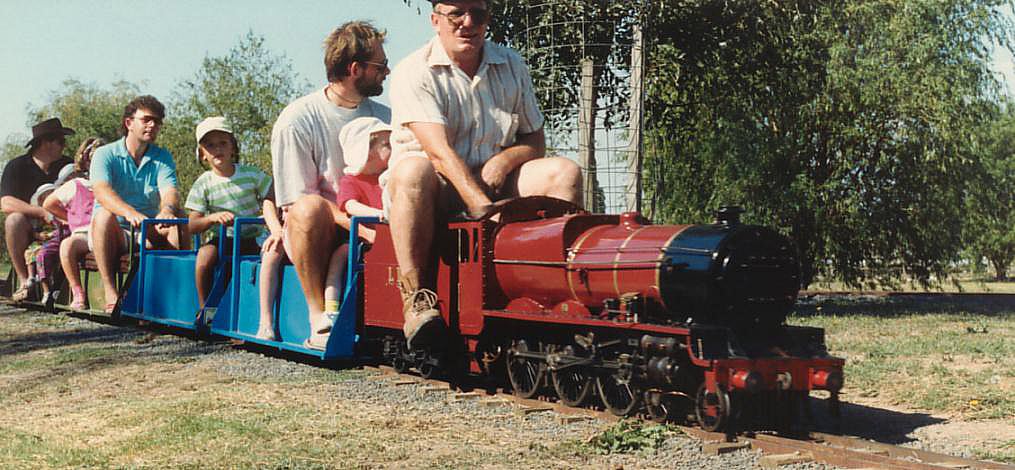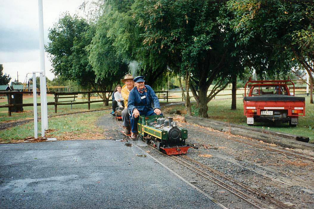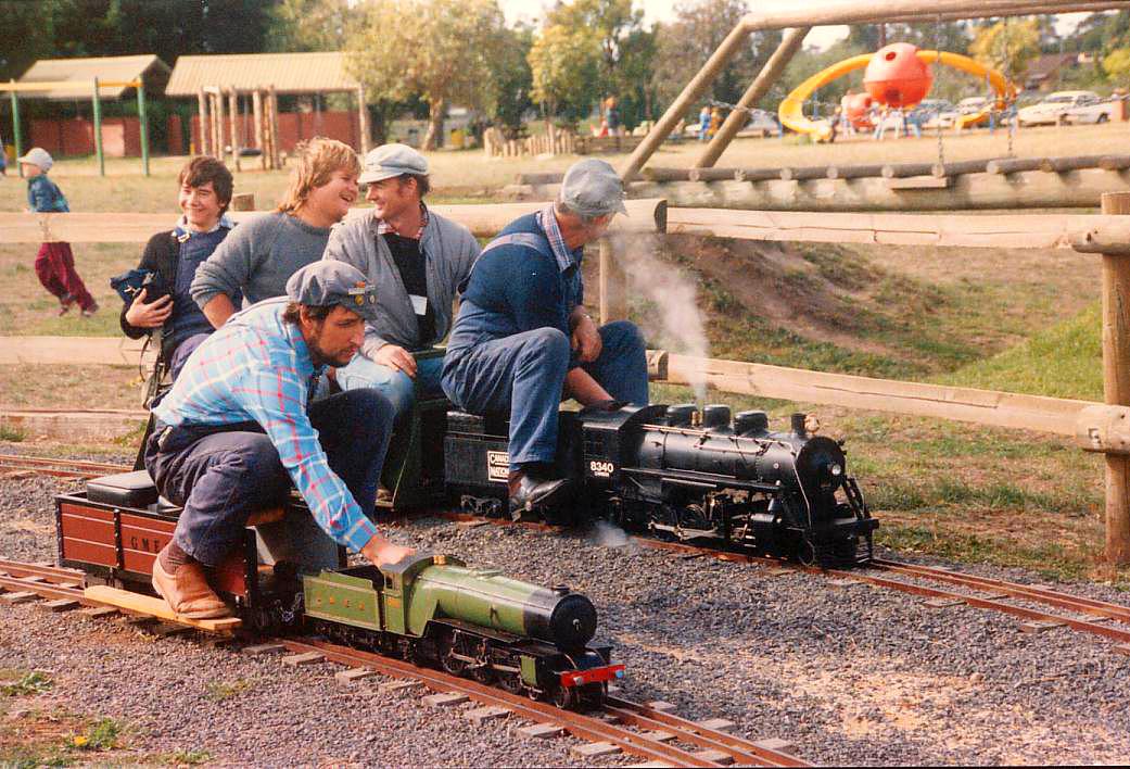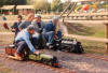 Albert and "Sweet Pea" on 5" gauge (foreground), Peter and "Tich" also on 5" gauge and Eric with "Maisie" on 3½" gauge (but with 7¼" gauge Royal Scot tender).