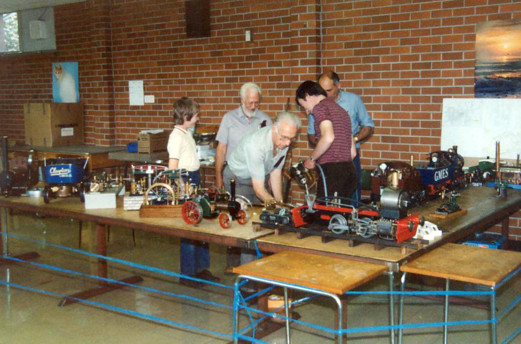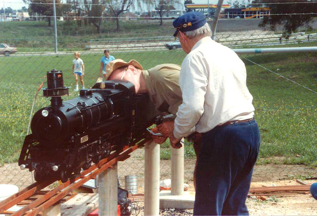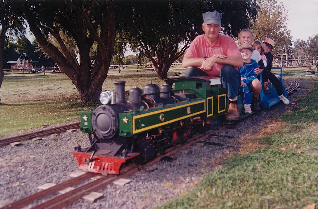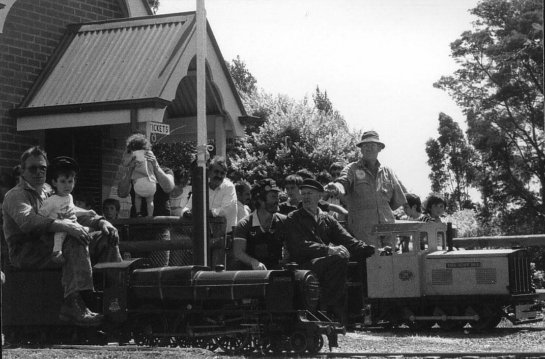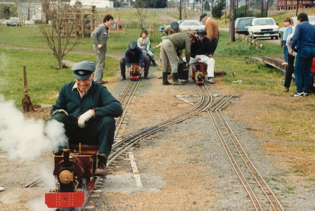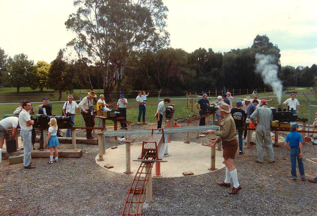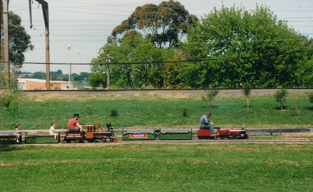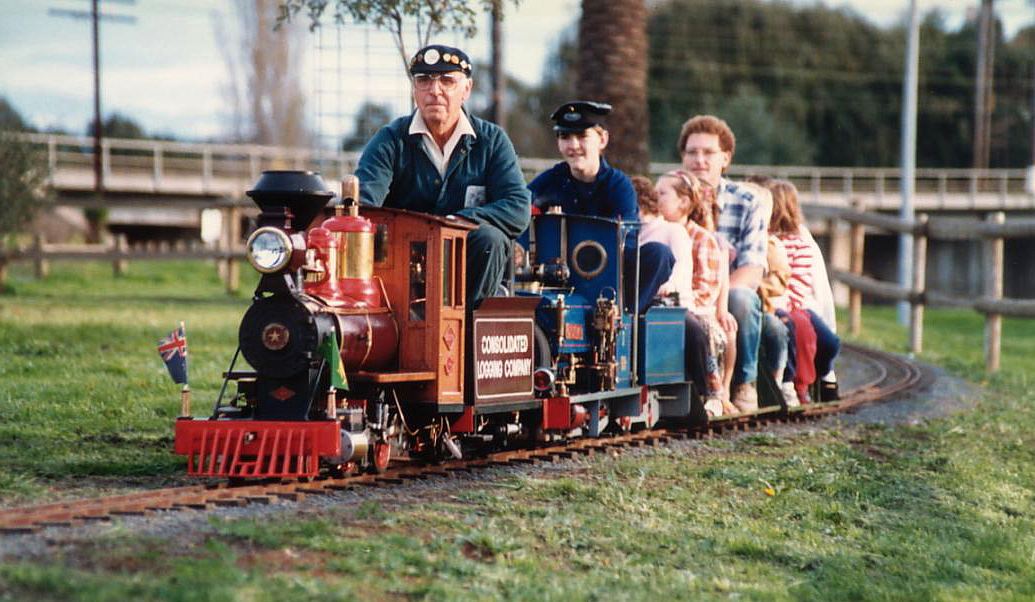 Albert and "Sweet Pea" on 5" gauge (foreground), Peter and "Tich" also on 5" gauge and Eric with "Maisie" on 3½" gauge (but with 7¼" gauge Royal Scot tender).